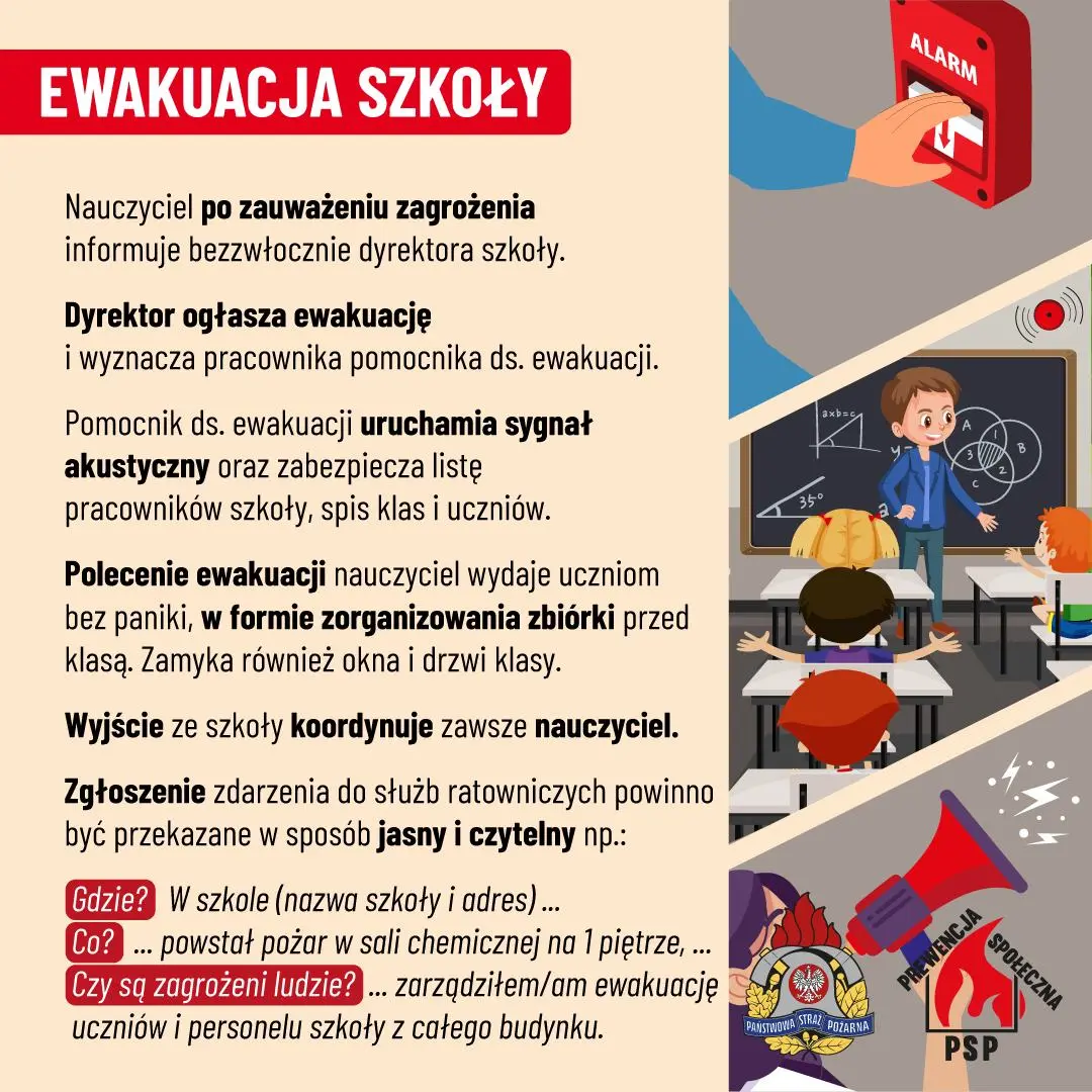 Poniżej znajdziecie kilka przydanych grafik poruszających tematykę ewakuacji w szkołach.