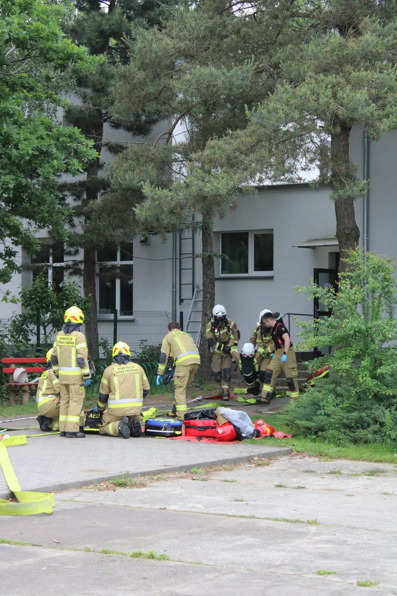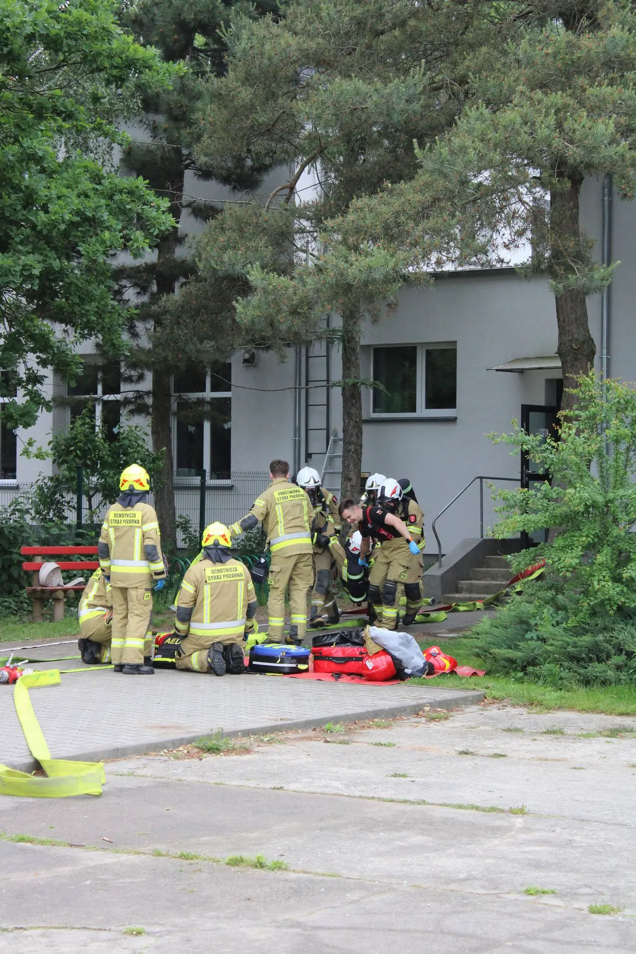 Dodatkowym elementem ćwiczeń była symulacja zasłabnięcia jednego ze strażaków oraz przećwiczenie procedur ratowniczych związanych z udzieleniem mu pomocy.